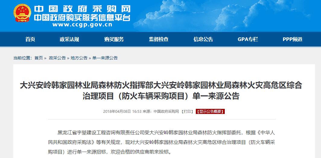 據(jù)林業(yè)局領(lǐng)導(dǎo)介紹,該批車(chē)輛到達(dá)林業(yè)局后下發(fā)至林業(yè)局防火辦,主要用于森林滅火人員物資輸送,后勤保障救援,防火器材運(yùn)輸?shù)戎饕ぷ,因此?duì)車(chē)輛的質(zhì)量要求極其嚴(yán)格,對(duì)我們公司提供的防火車(chē)輛給出高度評(píng)價(jià),此批車(chē)輛為韓家園林業(yè)局經(jīng)過(guò)層層篩選,反復(fù)招投標(biāo)后才確定的車(chē)型,公司接到中標(biāo)通知書(shū)時(shí)也是很激動(dòng),能接上這樣的森林防火設(shè)備運(yùn)輸車(chē),也對(duì)我們的服務(wù),質(zhì)量提出更高的要求。該局領(lǐng)導(dǎo)介紹由于林區(qū)防火公路多為簡(jiǎn)易道路,對(duì)車(chē)輛通過(guò)性要求很高,我公司提供的四驅(qū)越野卡車(chē)能夠滿(mǎn)足他們的需求。下圖為招標(biāo)公示。