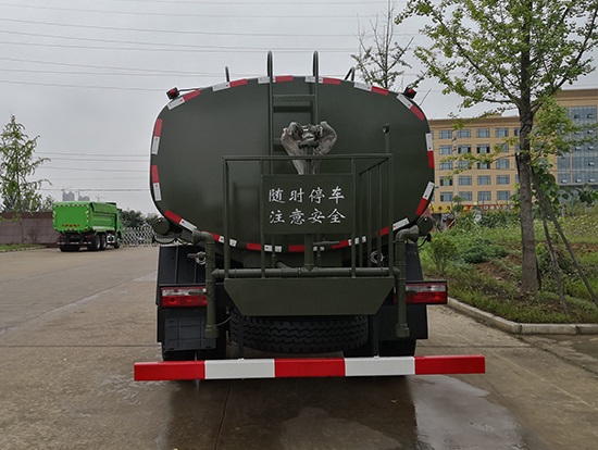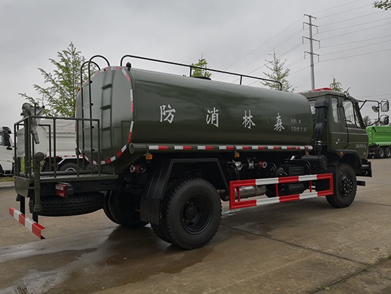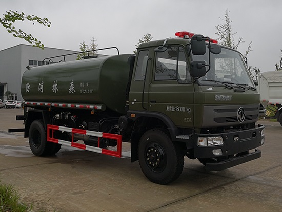 采用東風(fēng)EQ2180GD5DJ型越野汽車底盤,東風(fēng)一排半寬體駕駛室,4×4驅(qū)動(dòng),康明斯ISB190 50國五發(fā)動(dòng)機(jī),六檔變速箱,東風(fēng)商用車橋,前驅(qū)動(dòng)橋3.8噸,后橋10噸,10.00R20輪胎,軸距4500mm,電動(dòng)玻璃,方向助力,斷氣剎,ABS。罐體采用優(yōu)質(zhì)碳鋼QB235板材,板材厚度4mm,罐體容積11.1立方,變速箱安裝取力器,大功率水泵可泵進(jìn)泵出,后置工作平臺(tái)帶水炮射程25米,消防栓接口左右各一個(gè),選裝駕駛室頂部安裝長條警燈帶喊話器,全車顏色軍綠,兩側(cè)噴涂白色森林消防字樣。