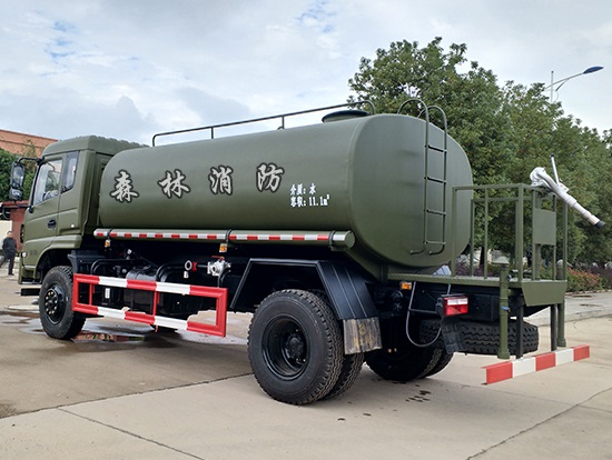 采用東風EQ2180GD5DJ型越野汽車底盤,東風一排半寬體駕駛室,4×4驅動,康明斯ISB190 50國五發(fā)動機,六檔變速箱,東風商用車橋,前驅動橋3.8噸,后橋10噸,10.00R20輪胎,軸距4500mm,電動玻璃,方向助力,斷氣剎,ABS。罐體采用優(yōu)質碳鋼QB235板材,板材厚度4mm,罐體容積11.1立方,變速箱安裝取力器,大功率水泵可泵進泵出,后置工作平臺帶水炮射程25米,消防栓接口左右各一個,選裝駕駛室頂部安裝長條警燈帶喊話器,全車顏色軍綠,兩側噴涂白色森林消防字樣。