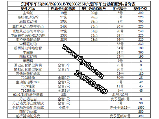 東風(fēng)六驅(qū)軍車EQ240主要分動箱配件有:主動軸、高檔主動齒輪、后橋驅(qū)動軸、高檔從動齒輪帶小齒、低檔從動齒輪帶小齒、中間軸中后橋驅(qū)動齒輪、中橋驅(qū)動軸齒輪、中橋驅(qū)動軸、前橋驅(qū)動軸嚙合套、中間軸、前橋驅(qū)動軸、半圓鍵、滑動齒套限位彈簧、換擋齒套限位鋼球、高低擋滑動齒套、7208軸承、主動軸軸承7308、7309軸承、7608軸承、9249/54軸承帶隔套、分動箱油封、分動箱叉形凸緣總成、分動箱外殼加蓋總成、前加力總成、前橋驅(qū)動軸外殼等。