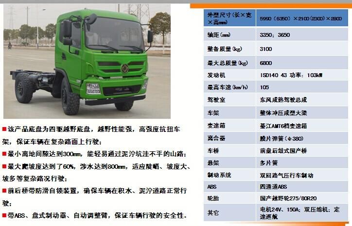 相關(guān)車型EQ2070GZ4DJ越野四驅(qū)底盤的詳細描述:該產(chǎn)品底盤為四驅(qū)越野底盤,越野性能強,高強度抗扭車架,保證車輛在復(fù)雜路面上行駛時,不會出現(xiàn)大梁斷裂等情況;最小離地間隙達到300mm,能輕易通過泥濘坑洼不平的山路;最大爬坡度達到了60%,適應(yīng)陡峭、坡度大、坡多等復(fù)雜路況行駛。前后橋帶防滑自鎖裝置,確保車輛在積水、泥濘道路正常行駛;帶ABS、盤式制動器、自動調(diào)整臂,保證車輛行駛的安全性。