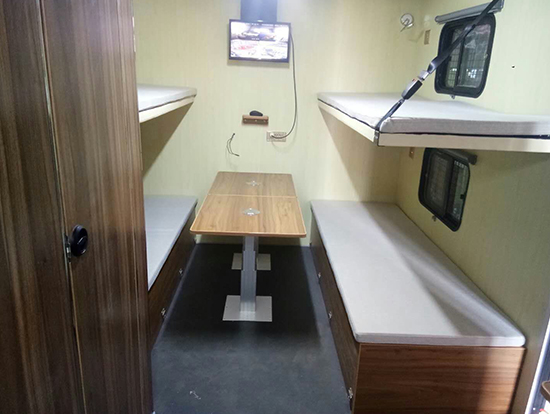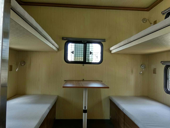 3、休息區(qū)備有4個上下鋪8個床位,配有床墊,每個上下床鋪依靠的墻壁上都有一個風景透氣窗。每個床鋪下面設一組附件柜,床位兩側上方各配衣帽鉤、插座和可調節(jié)床頭燈,休息區(qū)配有19寸液晶電視一臺及空調一部。